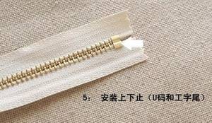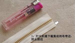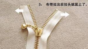 先用打火機(jī)燒下剪裁的布帶邊,防止脫落。拉齒尖朝上方向,把拉鏈頭拉進(jìn)齒中,雙拉捏住布帶兩端一起向外拉,拉鏈頭會(huì)順著布帶向外的張力下進(jìn)到拉齒中。布帶拉出后就可裝上拉頭。用斜嘴鉗拔出多余的拉齒。安裝上下止即可。具體步驟如下: